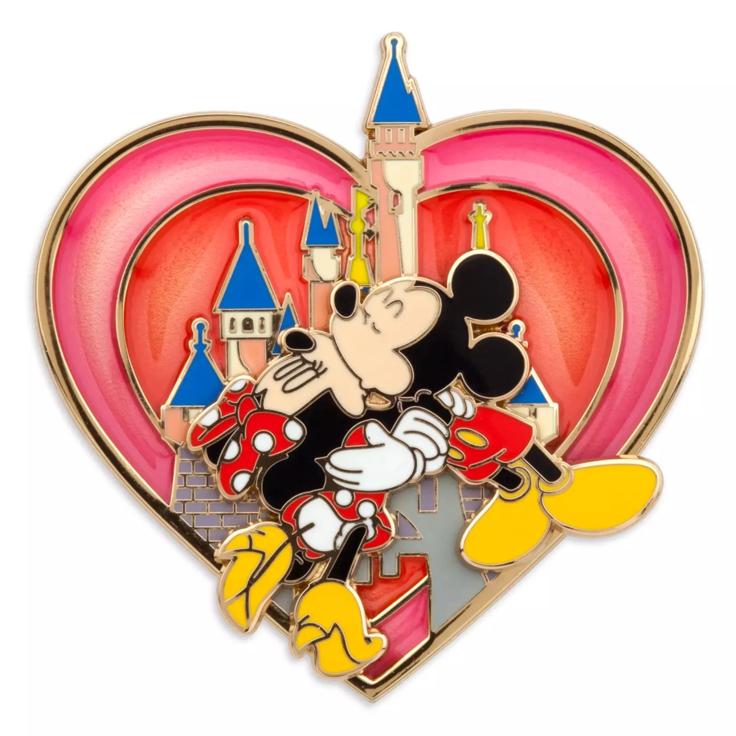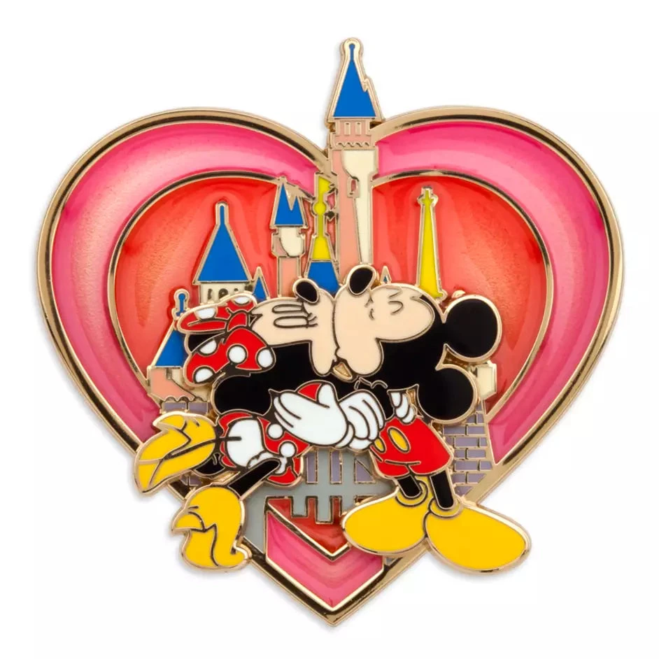 Swept away by the fairytale romance of our Fantasyland Castle, Mickey and Minnie share a legendary smooch for this heart-shaped pin-on-pin design that will make a sweet gift for someone special.