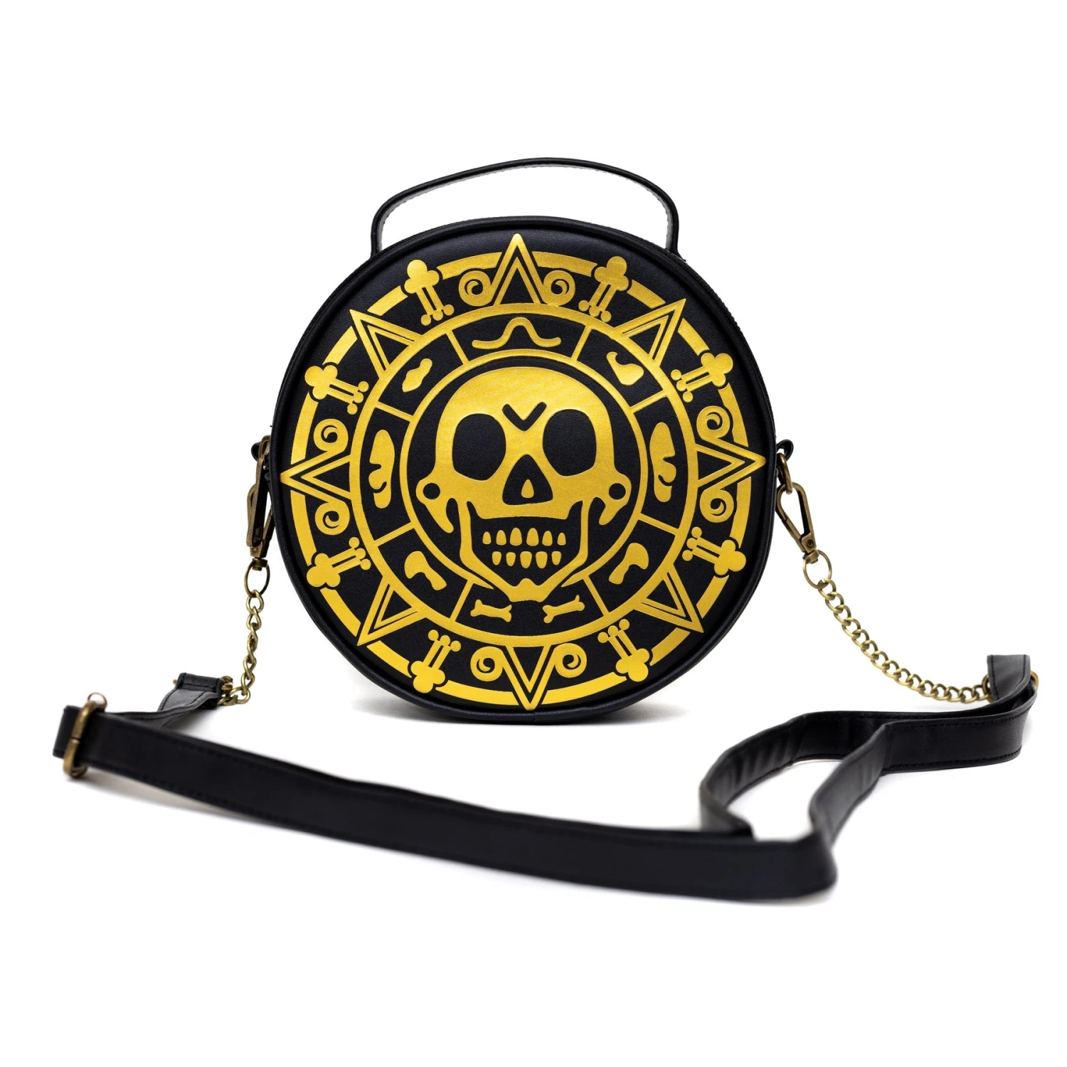 Introducing the Pirates of the Caribbean Cursed Aztec Coin Crossbody, a round crossbody bag that’s perfect for any Pirates fan! This bag features a stunning matte metallic gold raised relief of the aztec coin. Crafted from high-quality vegan leather, this bag is both stylish and sustainable. The pirates bag measures 8.0″ x 8.0″ x 2.5″, making it the perfect size for all your everyday essentials.